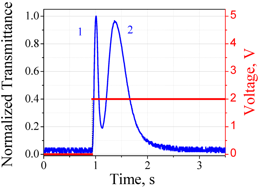 The electro-optical response shown in Figure 1 exhibits two peaks; the first peak (labeled as “1”) is relatively fast (less than a fraction of a second), and the second one (marked as “2”) is relatively slow (around one second). Peak 1 shown in Figure 1 corresponds to the reorientation of the liquid crystal from a planar orientation toward a homeotropic. The time needed to complete this reorientation can be estimated by applying the expression Equation (4):