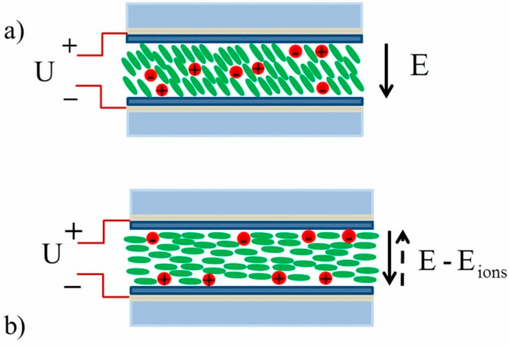 (a) Schematic representation of the liquid crystal reorientation under the action of a DC electric field; (b) Applied electric field is screened by the field of the space-separated ions in the liquid crystal. (Drawn after Ref. [51]).