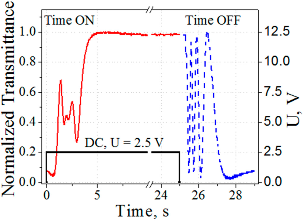 By applying the proper chemical design along with the methods of chemical synthesis and post-synthetic techniques, many improved liquid crystal materials were successfully produced and tested in numerous applications [2,28,83,84,85,86]. The high resistivity liquid crystals are characterized by extremely low levels of ionic impurities. As a result, such materials are much more reliable than their contaminated counterparts considered in the Section 2.1.2. Ion related effects are hardly observed in the high resistivity liquid crystals (assuming they are not accidentally contaminated). For example, the charge screening effect, which is easily detectable in liquid crystal E7, (Figure 1) is practically not observable in the case of the high resistivity liquid crystal TL205 (a mixture of cyclohexane-fluorinated biphenyls and fluorinated terphenyls) (Figure 3, the experimental set up of which is the same as in Figure 1). A DC electric field applied across the liquid crystal cell reorients the liquid crystal molecules (the reorientation region is shown as “Time ON” in Figure 3). After the reorientation process is completed, the reached level of the transmittance of the liquid crystal cell does not change (the electric field is still applied across the cell). When the electric field is turned off, the liquid crystal molecules reorient back to their initial planar state (Figure 3, the region “time OFF”).
