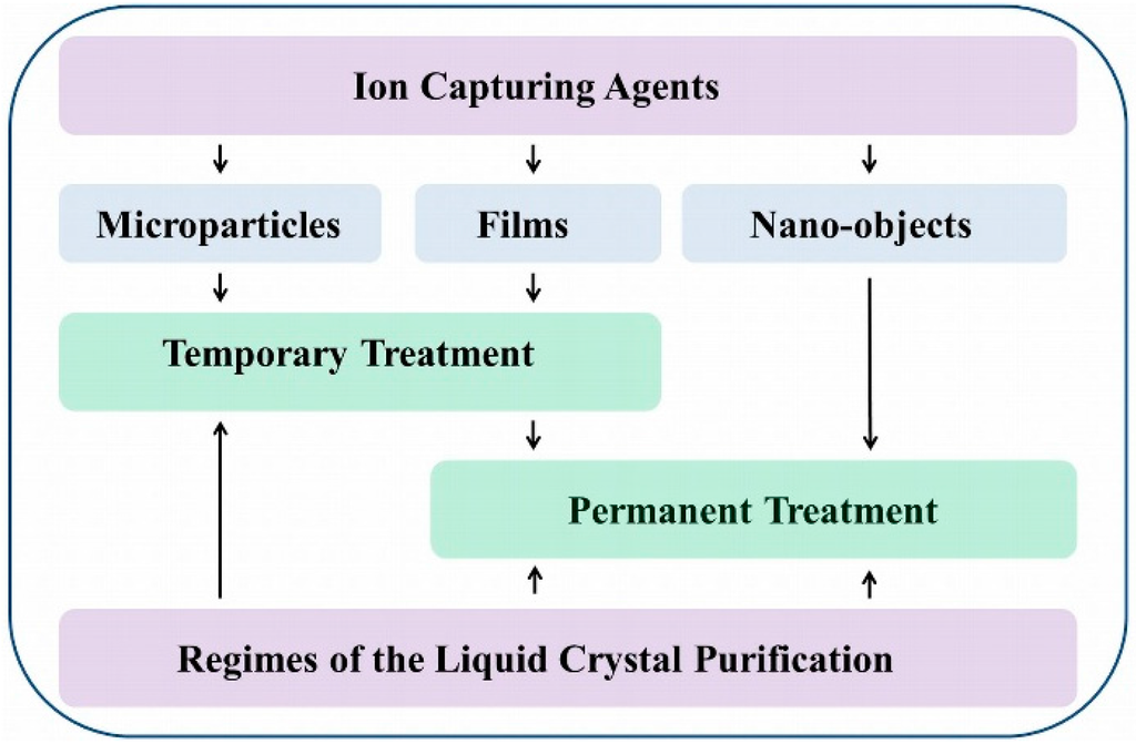 Consider the ion-capturing agents fabricated in the form of films, microparticles, and nanoparticles. Such ion capturing agents can be used for both temporal and permanent purification of liquid crystals, as shown schematically in Figure 4.