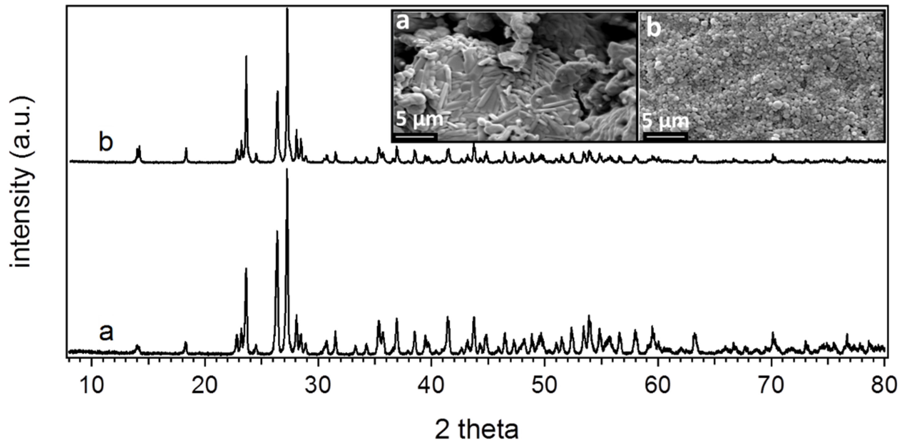 The effect that sonication has on the morphology and composition of the iodine oxide particles was examined by comparing as-received material to material suspended in denatured ethanol, sonicated, drop-cast onto a substrate, and allowed to evaporate under dry nitrogen (~2% relative humidity). Figure 2 shows the resulting X-ray diffractograms of the two materials and the inset shows their change in morphology as observed in a scanning electron microscope (SEM). The resulting diffraction patterns are nearly identical to one another and agree with known pattern for HI3O8 (PDF # 04-011-9546) [51]. Neither iodic acid, HIO3, nor iodine pentaoxide, I2O5, were observed under these conditions, the former being somewhat surprising given that the trace amounts of water present might be expected to hydrate some of the HI3O8 into HIO3 [8].