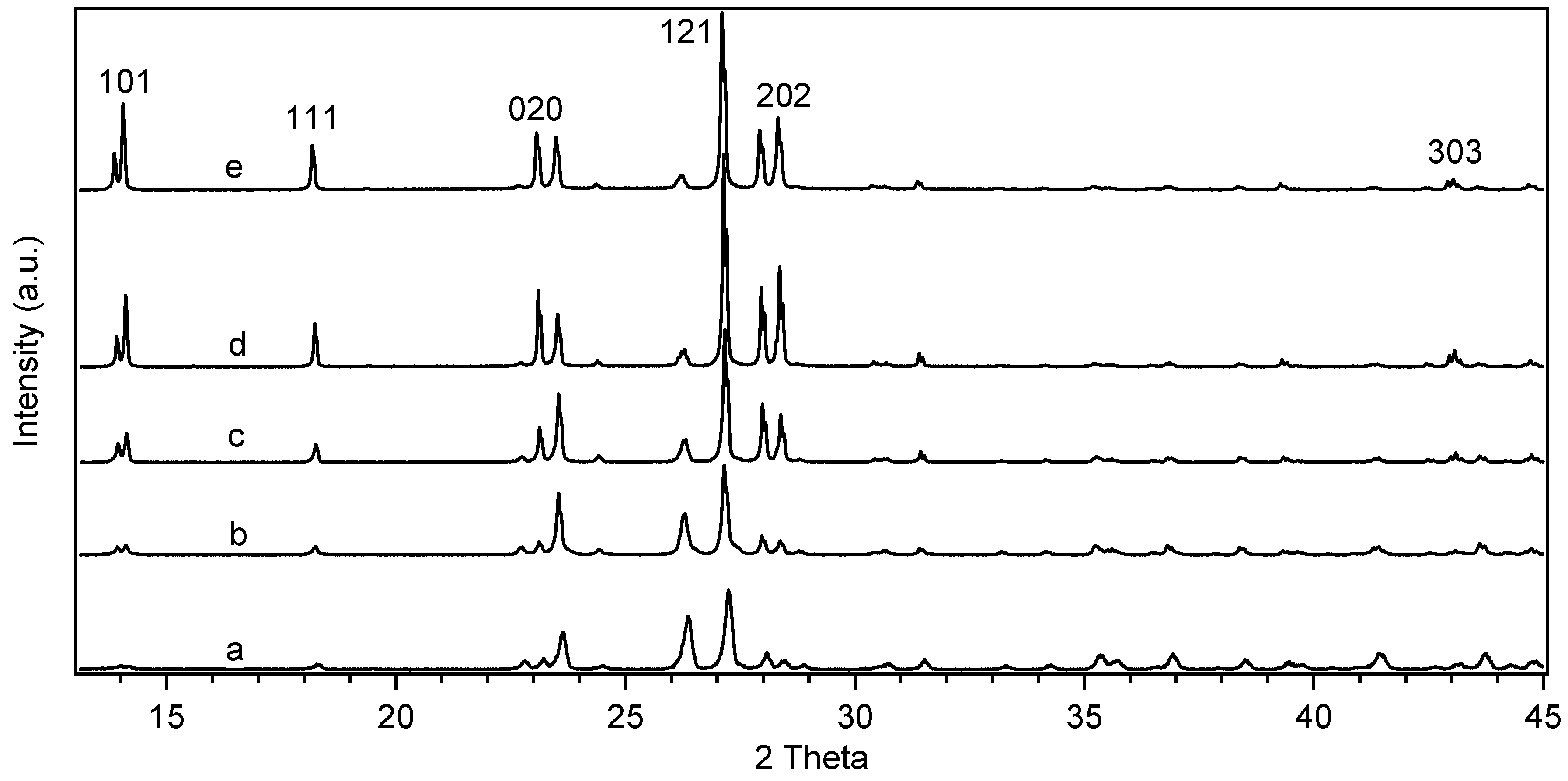 Powder X-ray diffractograms of HI3O8 in various forms normalized by total area: (a) HI3O8, as received material; (b) drop casted film; and (c–e) spin coated films at 500 rpm, 1500 rpm, and 2500 rpm. Films were deposited at ~2% relative humidity from a sonicated suspension of the as received material in denatured ethanol.