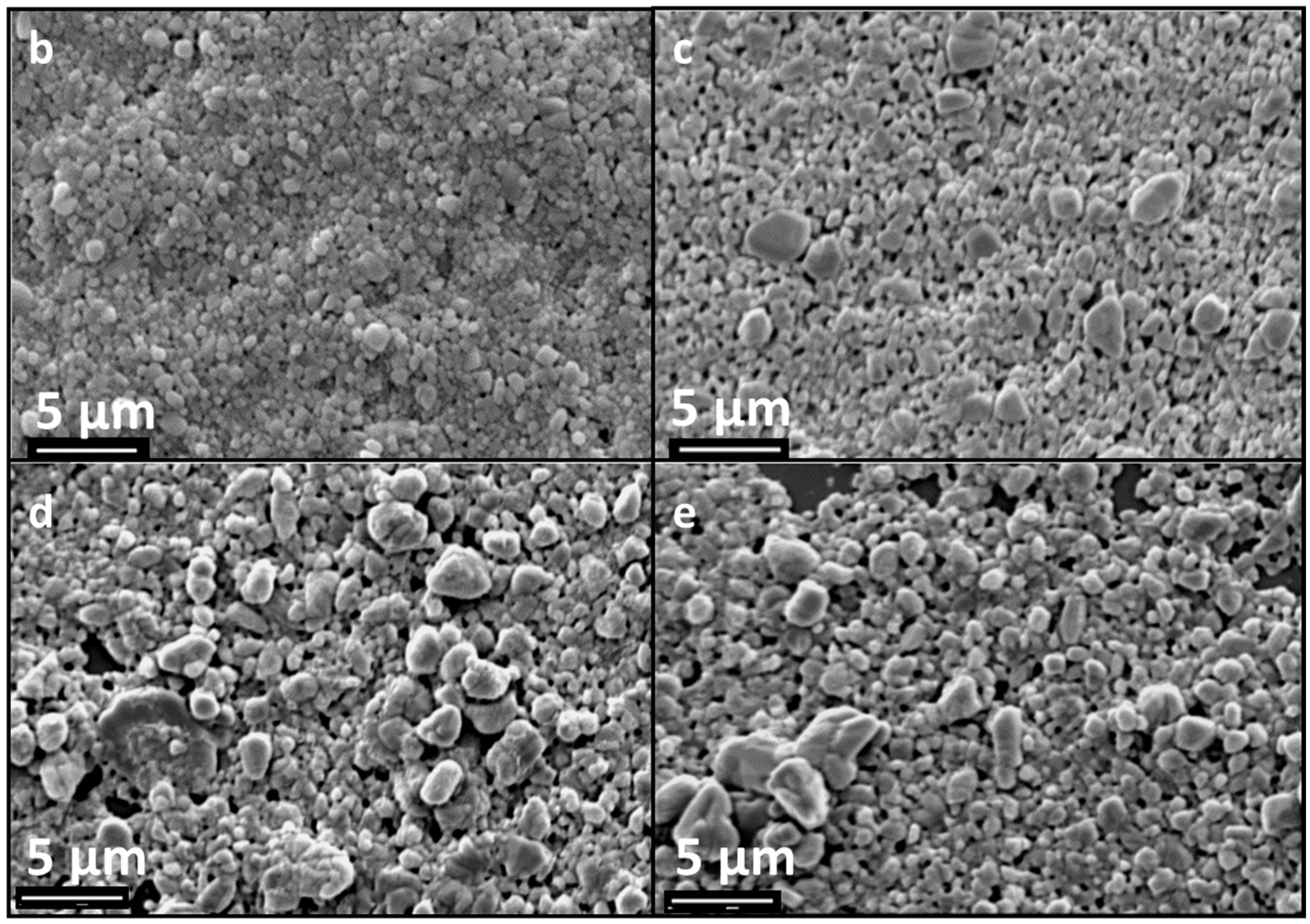 Scanning electron microscopy images of deposited HI3O8 films: (b) drop casted; (c–e) spin coated at 500 rpm, 1500 rpm, and 2500 rpm. Films were deposited at ~2% relative humidity from a sonicated suspension of the as-received material in denatured ethanol. Note that figure labels used here correspond to the same samples and labels shown in Figure 4.