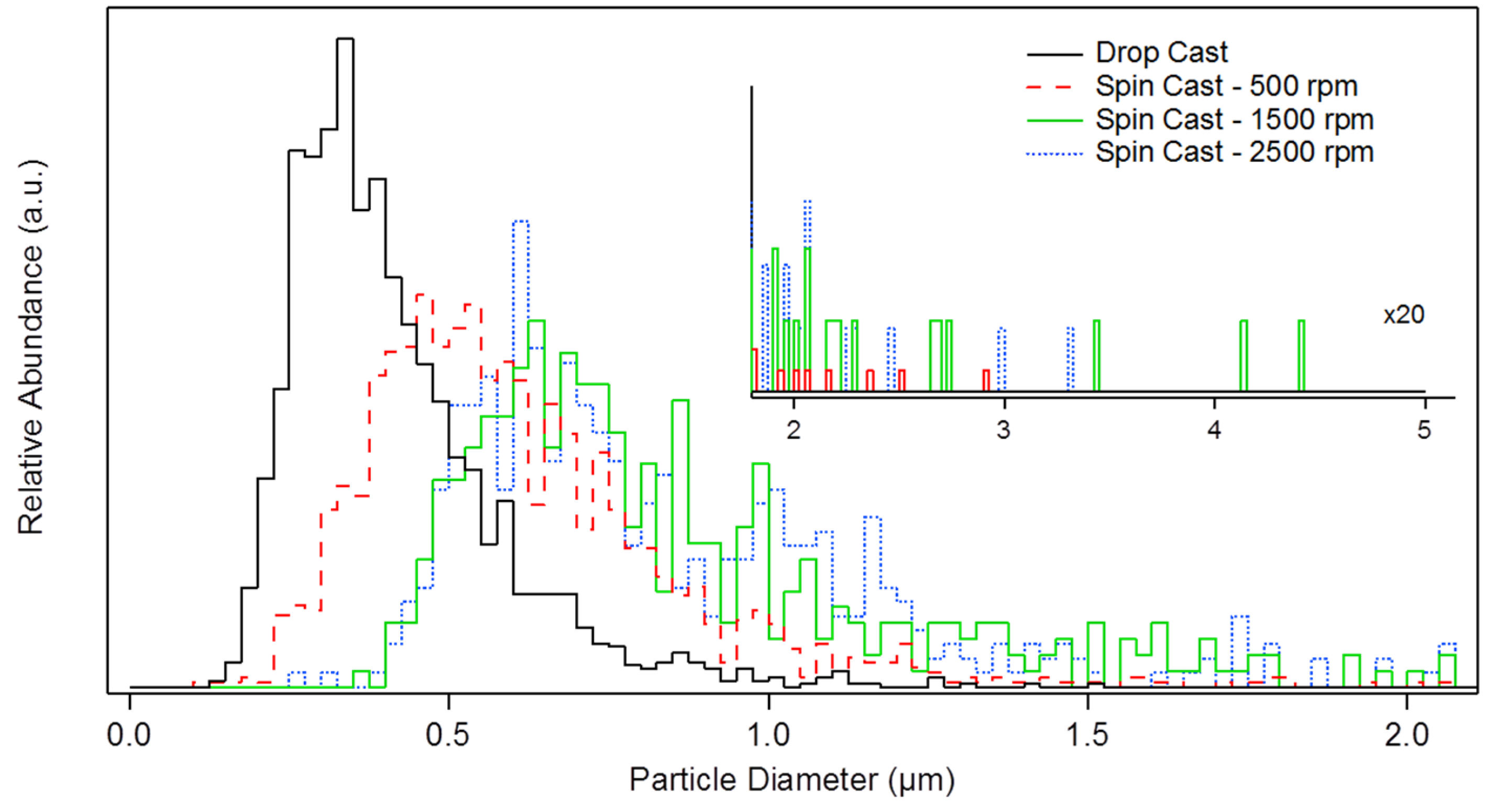 To examine this effect more closely, scanning electron microscopy images were recorded of each of the four films, the results shown in Figure 5. Each sample set contained 500 to 1000 particles. These images show that both the particle sizes increase significantly with spin rate and that the particle shapes become less spherical, possibly slightly more elongated. The observed particle size distributions (normalized) from these images are depicted in Figure 6, clearly showing the increase in size of the particles with spin rate. The drop cast film contains an average particle size of ~0.4 μm, whereas the highest spin rates produced material with an average particle size of ~0.9 μm. It is important to note that this change not only appears to increase the fraction of particles in the tail of the initial distribution, but also appears to reduce the amount of fine particles as the spin rate increases. This is likely due to the finer particles being washed away in carrier fluid during the spinning process.