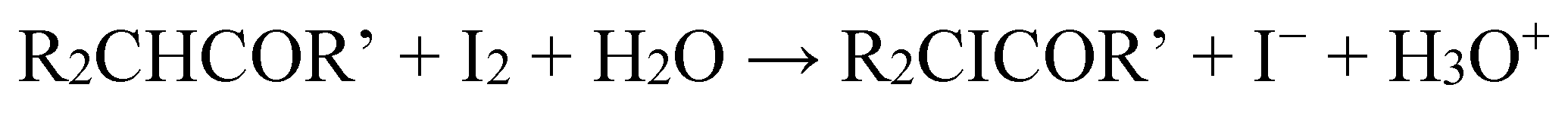 In contrast, the ethanol:2-butanone solution (and confirmed with ethanol:acetone, not shown) exhibit two, weaker absorptions at λmax = 360 nm and 440 nm and the lack of the 520 nm feature. These observations strongly suggests the iodation of the ketone after oxidation of the ethanol, thereby forming the iodoketone and aqueous iodide, according to reaction Scheme 2 [47,48]: