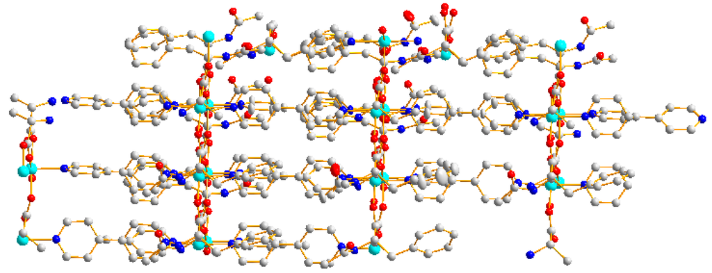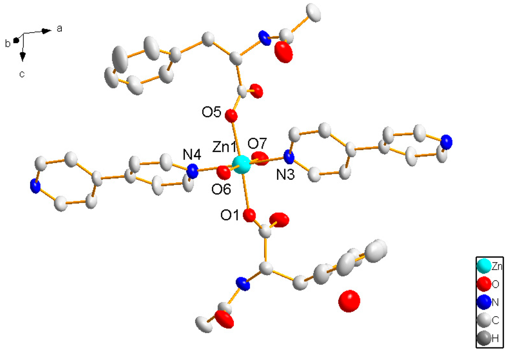 N-acetyl-l-phenylalanine, 4,4′-bipyridine, Zn(OAc)2·2H2O, NaOH and solvents were purchased commercially and used without further purification. Elemental analyses for C, H and N were carried out on a Elementar Vario III EL elemental analyzer. The FT-IR spectra were recorded in the range 4000–400 cm−1 on a Nicolet AVATAR 360 FTIR Spectrophotometer (Nicolet Instrument Inc., Madison, WI, USA). Luminescence spectra were measured on a PE LS-55 fluorescent spectrophotometer (PerkinElmer, Billerica, MA, USA). Single crystal data of {[Zn(L)2(4,4′-bipy)]·(H2O)}n were collected by a Bruker smart CCD diffractometer(Bruker, Billerica, MA, USA).