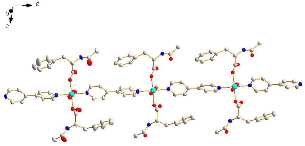 In summary, we have synthesized and characterized a new 1D chained coordination polymer of Zn(II). The results show that the molecules form one-dimensional chained structure by its the bridging 4,4′-bipyridine ligands. The antitumor activities and luminescent properties of Zn(II) coordinationpolymer have also been investigated. Based on the above results, more and more coordination polymers containing N-acetyl-l-phenylalanine and 4,4′-bipyridine ligands will be synthesized to study their novel structures and properties.