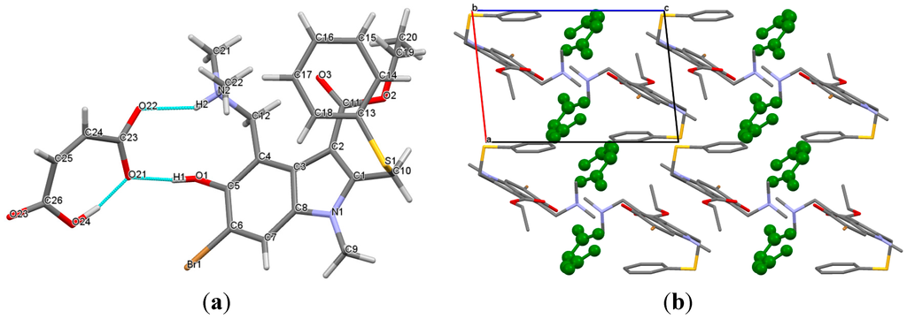 As expected, arbidol and maleic acid form a salt, which crystallizes in the triclinic Pī space group with one arbidol cation and one maleate anion in the asymmetric unit. The structure is in good agreement with that reported by Orola et al., who, however, collected diffraction data at 293 K [22]. In this work, single-crystal X-ray experiment was carried out at low temperature (180 K), and the crystal structure of the [Arb + Mlc] salt was refined. Figure 2a shows that the arbidol and maleate ions are connected by two different types of hydrogen bonds, i.e., the charge-assisted N2+–H2···O22‒ and conventional O1–H1···O21 H-bonds, to form a discrete dimeric unit with graph set notation [31,32]. The packing arrangement of the Arb molecules in the crystal can be described as alternating layers containing the π-stacks of the indole moieties (3.449 Å) and phenyl rings. The latter form planar layers extended along the (100) planes (Figure 2b). The maleate ions are located between the adjacent Arb units to form layers in the (011) planes.