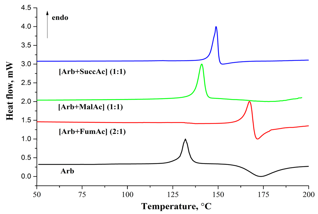 The distribution of cocrystals according to the difference between the melting temperatures of API and cocrystal shows that it is most typical of cocrystals to have 30–50 °C higher melting temperatures than the low-melting component does—API in this case (33.56% of all cocrystals) [39]. Only the [Arb + Fum] salt follows this trend. The melting temperature increase in [Arb + Mlc] salt and [Arb + Suc] cocrystal is not so significant, and equals 8.6 and 17.9 °C, respectively. Such systems are found 2.5 times less frequently (in 13.61% of cocrystals).