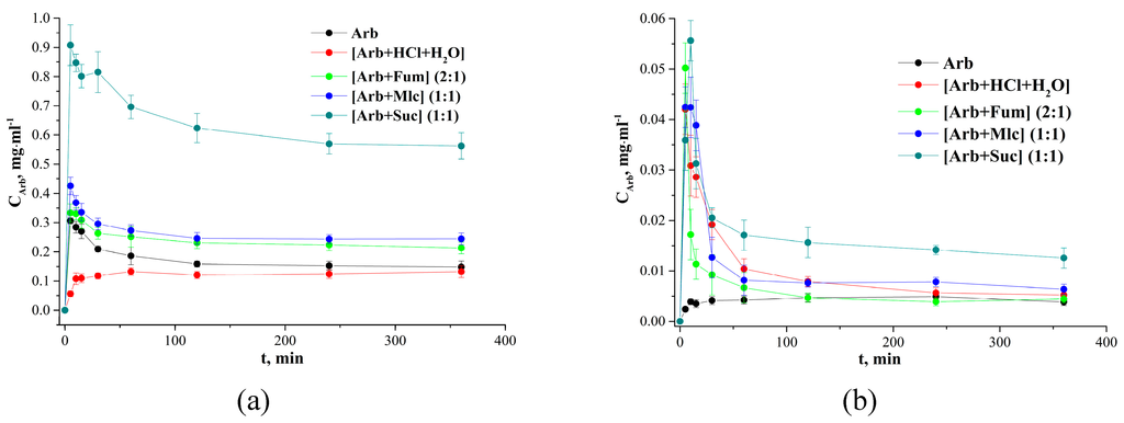 There are considerable decreases in solubilities observed in all the systems under investigation at pH 6.8 as compared to the solubility in water with pH 1.2. The decrease in the maximum concentration values varies from 3 times (for [Arb + HCl + H2O]), to 60 times (for Arb). The maximum concentration of Arb salts and cocrystal with dicarboxylic acids fall in the following order: 6.6 times ([Arb + Fum]) < 10 times ([Arb + Mlc]) < 16.5 times ([Arb + Suc]). Nevertheless, salts and cocrystal demonstrate elevated concentration levels during the first 60 min of dissolution. However, it is obvious that the Arb concentration value in cocrystal (as for Arb salts) decreases to Arb free base solubility value, which is equal to ca. 0.004 ± 0.001 mg·mL−1. XRPD analysis of the solid phase recovered after the experiment reveals no transformation of Arb during the solubility study. All the salts, however, were seen to undergo a solution-mediated transformation to Arb during the solubility process. Thus, it can be assumed that dissolution in a pH 6.8 buffer leads to Arb salts transformation into pure Arb in the bottom phase. This assumption has been confirmed by the XRPD analysis of solid phases recovered after the experiment (Figure S5). As in buffer with pH 1.2, the cocrystal dissolution process in buffer pH 6.8 differs from salt dissolution. The Arb concentration level for cocrystal [Arb + Suc] is still two times higher than the solubility values for the other systems after 6 h of the experiment. However, the Arb concentration values decrease faster in the phosphate buffer with pH 6.8 than in the hydrochloric buffer with pH 1.2.