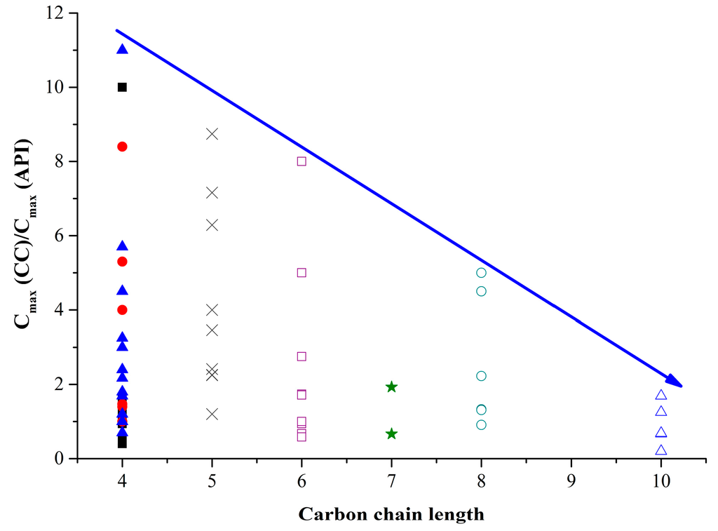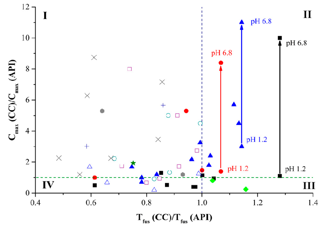 The melting temperatures of single-component molecular crystals are normally used to describe/evaluate/imitate the energy of crystal lattice, as in the general solubility equation of Yalkowsky and Valvani [42]. In addition, it has been shown previously that there is a linear correlation between the sublimation Gibbs energy and the melting temperatures of structurally similar compounds [39,43]. An increase in the melting temperature leads to the sublimation Gibbs energy growth, which must reduce the solubility values. Thus, it can be assumed that in multicomponent crystals (cocrystals and salts) a melting temperature increase lowers the solubility values. To prove this assumption, we analyzed the known cocrystals and salts of different API with dicarboxylic acids. Figure 8 shows the analysis results as a diagram in coordinates of the melting temperature ratio (Tfus(CC)/Tfus(API)) versus their maximal solubility ratio (Cmax(CC)/Cmax(API))).