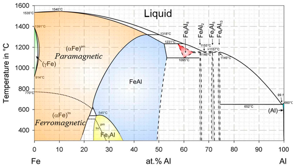 - Palm, M. Fe-Al materials for structural applications at high temperatures: Current research at mpie. Int. J. Mater. Res. 2009, 100, 277–287. [Google Scholar] [CrossRef]