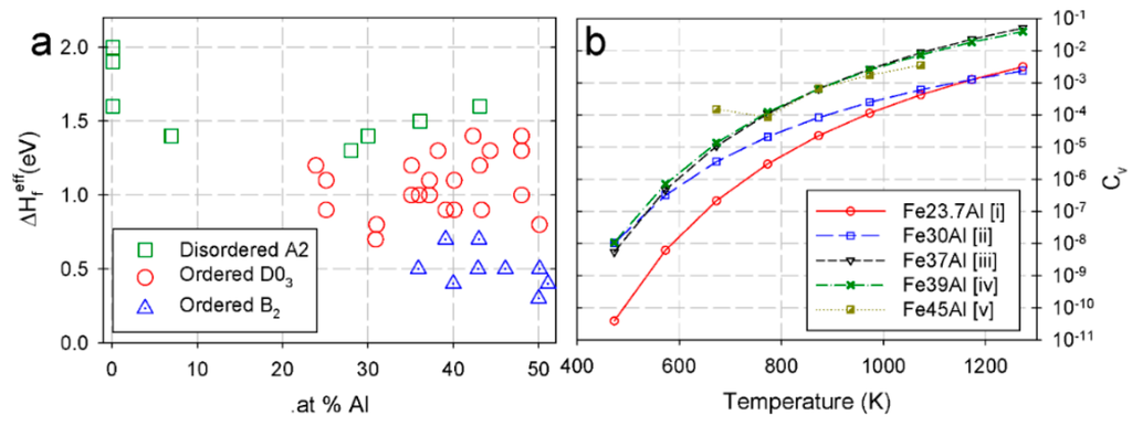 | Fe-50Al | 0.26 [142] | 2.257 × 10−10 [149] |