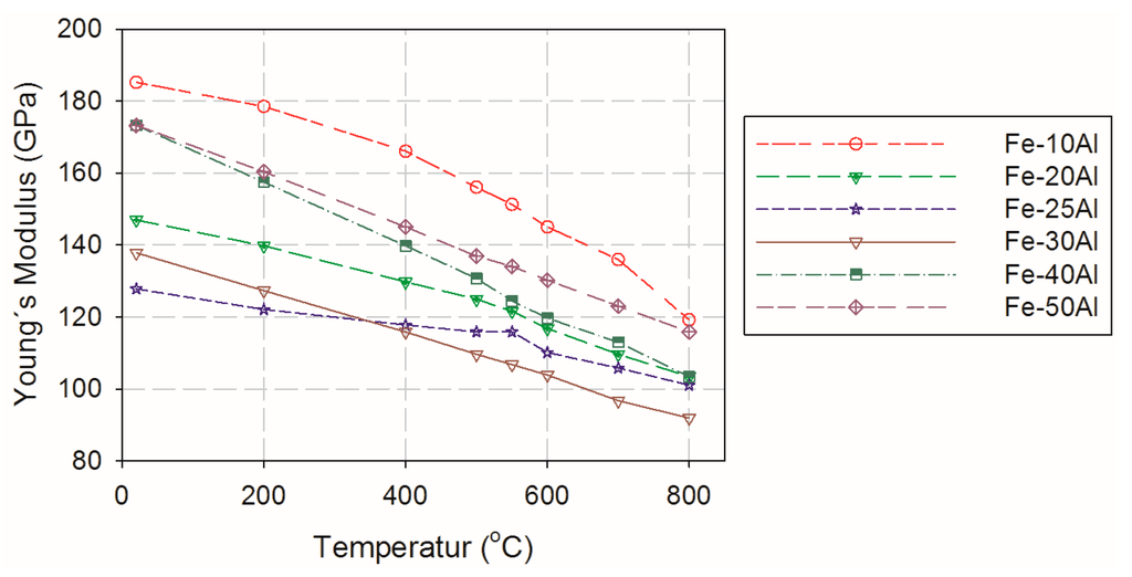 - Koster, W.; Godecke, T. Physical measurements on iron-aluminium alloys between 10 and 50 at.-% Al. Iv.—The modulus of elasticity of the alloys. Z. Metallkd. 1982, 73, 111–114. [Google Scholar]