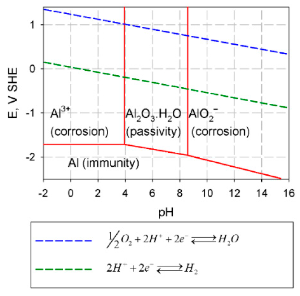 - McCafferty, E. Thermodynamics of corrosion: Pourbaix diagrams. In Introduction to Corrosion Science; Springer: Berlin, Germany, 2010; pp. 95–117. [Google Scholar]