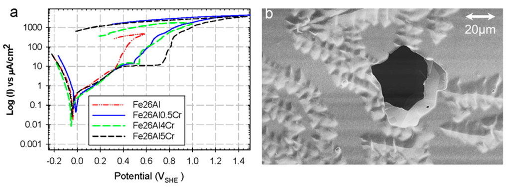 - Zamanzade, M.; Barnoush, A. Effect of chromium on the electrochemical properties of iron aluminide intermetallics. Corros. Sci. 2014, 78, 223–232. [Google Scholar] [CrossRef]