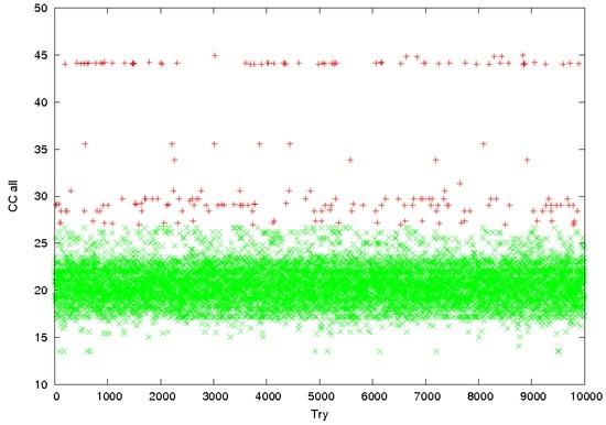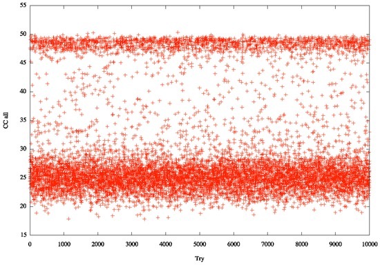 Scatter plot of CCall calculated by SHELXD versus try number for 2’-thio decamer.