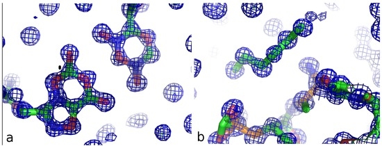 As a further test of the quality of the Z-DNA data, phasing was done using all data to 0.95 Å by direct methods using SIR2004 [59]. The Z-DNA data set was given to SIR2004 using the “nopatterson” option so that phasing was done using only the tangent method and the anomalous signal in the data was ignored (Figure 5a). Direct methods phasing was able to produce a map of sufficient quality to automatically place six atoms of the spermine molecule correctly (see Figure 5b). The resolution of the data is critical to the success of the direct methods tangent procedure given 240 non-hydrogen atoms in the asymmetric unit. The tangent procedure was unsuccessful when the data were limited to 1.1 Å resolution.