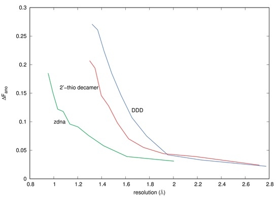 where is the number of anomalous scatterers, phosphorus atoms, is the number of protein atoms and which is the effective scattering from an average atom at diffraction angle θ. The theoretical value of /F for nucleic acid crystal containing one phosphorus atom per base has been calculated by Dauter and Adamiak [52] to be about 2.0%. Calculation of /F for actual diffraction data is necessarily overestimated and the degree of overestimation provides a measure of noise in the anomalous signal. A comparison of the /F ratio plotted by resolution for the three data sets is presented in Figure 9.