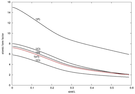 Plot of scattering factors calculated using Cromer-Mann coefficients in a four Gaussian approximation. The effective scattering, f(eff), is calculated by weighting the scattering factor of each element by its relative proportion to the total number of non-hydrogen atoms in d(GT)/d(AC).