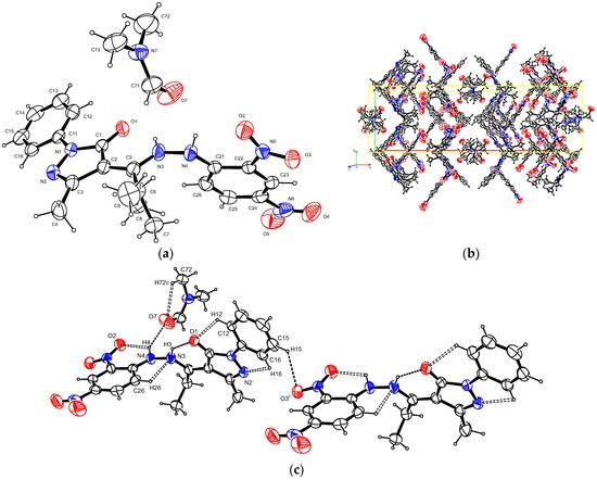 The asymmetric unit cell of the Pmmp-Dh crystal structure contains two molecules of Pmmp-Dh, and two solvent dimethylformamide DMF molecules, shown in Figure 6. The two Pmmp-Dh molecules are identical except for the rotation around the N–N bond, and at the propyl group of one of the molecules there is a rotational disorder in a 0.88:0.12 ratio. After the inversion of one of the molecules and overlaying, the Root-mean-square deviation of atomic positions (RMSD values) is only 0.0847 and the largest positional difference between two non-hydrogen atoms, O14 and O23, is 0.2923 Å. The average dihedral angle between the two least square planes through the phenazone groups and the dinitrophenylhydrazine groups is 80.8(2) Å.