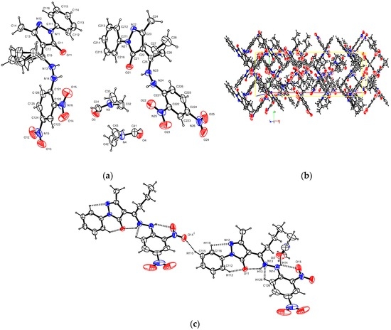 X-ray crystal structures of Pmmp-Dh with thermal ellipsoids drawn at 50% probability level: (a) Ortep diagram of Pmmp-Dh; (b) Unit cell contents of Pmmp-Dh viewed normal to (001); (c) Selected hydrogen bonding with symmetry elements i: x, 1 + y, z; ii: x, y, −1 + z. The colored lines are the unit cell axis orientation and the red and blue circles represent oxygen and nitrogen, respectively.