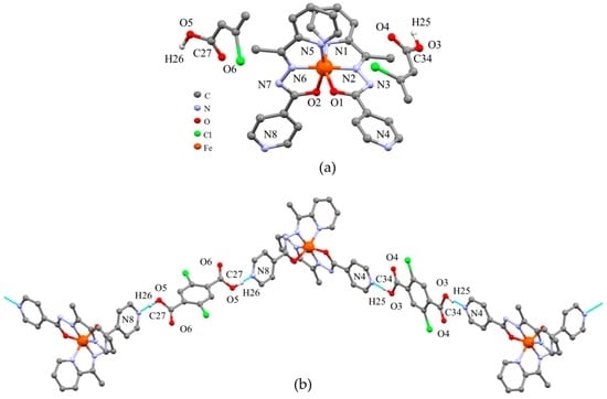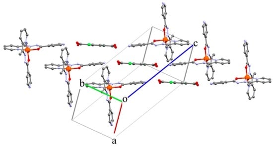 The crystal structures of 1-Cl and 1-Br were measured at 123 K and 320 K. The asymmetric unit and molecular arrangement of 1-Cl are displayed in Figure 1a,b, respectively. The crystal structures of 1-Cl and 1-Br are isostructural. Crystallographic data and tables of bond distances and angles for 1-Cl and 1-Br are listed in Table 1. The Fe(II)–N and Fe(II)–O coordination distances in 1-Cl and 1-Br at 123 K were 1.947(3)–1.966(3) Å and 1.989(2)–1.999(2) Å, respectively, which were consistent with those of low-spin Fe(II) complexes []. These coordination distances were found to increase with the increase in temperature, indicating that both 1-Cl and 1-Br exhibit SCO. However, the distances observed at 320 K were not equal to those expected to be achieved by high-spin Fe(II) complexes; therefore, SCO in both 1-Cl and 1-Br was not completed at 320 K. The crystal structural data measured at 320 K was not sufficient to determine the position of the hydrogen atom involved in hydrogen bond determination from the difference Fourier map. The Fe(II)–N and Fe(II)–O coordination distances in 1-Cl were observed to be larger than those in 1-Br at 320 K because 1-Cl has a higher rate of high-spin iron(II) than that of 1-Br at this temperature. As shown in Figure 1a, the asymmetric unit of 1-Cl comprises one Fe(II) complex and one H2Cl2TPA molecule. The molecular arrangement shows that a zig-zag chain was formed with an alternating arrangement of Fe(II) complexes and H2Cl2TPA molecules via hydrogen bonds formed between the N atom in the terminal Py ring in the Fe(II) complex and a carboxyl group in H2Cl2TPA (Figure 1b). The N4∙∙∙O3 hydrogen bond distance in the terminal pyridine ring was relatively long (N4∙∙∙O3 = 2.663 Å), whereas the N8∙∙∙O5 hydrogen bond distance was relatively short (N8∙∙∙O5 = 2.552 Å) at 123 K. The N4∙∙∙O3 and N8∙∙∙O5 hydrogen bond distances in 1-Br were slightly longer (N4∙∙∙O3 = 2.681 Å, N8∙∙∙O5 = 2.560 Å) than those in 1-Cl at 123 K. The N8∙∙∙O5 bond distances in 1-Cl and 1-Br were short for a N∙∙∙O-type hydrogen bond but slightly longer than those commonly observed in organic compounds that exhibit proton migration induced by temperature change [,,]. Regarding the temperature dependency of hydrogen bond distances, studies have reported that the hydrogen bond distance between the Py ring in isonicotinic acid hydrazide, a precursor of L, and the carboxyl group tends to increase with increasing temperature [,,]. The increment of N4∙∙∙O3 and N8∙∙∙O5 bond distances from 123 K to 320 K was observed in 1-Cl and 1-Br. In addition, the difference in hydrogen bond distances at 123 K and 300 K in 1-Cl was found to be larger than that in 1-Br, suggesting that the spin transition from low spin to high spin contributes to the elongation of hydrogen bond distance in these compounds. The O–H bond distances in the hydrogen bonds show that the hydrogen atoms involved in both the short and long hydrogen bonds were located closer to the H2Cl2TPA molecules at 123 K. The C–O bond distances in the carboxyl groups and the C–N–C angles in the terminal Py ring also support the proposition that the hydrogen atoms in the hydrogen bonds were located closer to the H2Cl2TPA molecules. At 123 K, the C34–O3 and C27–O5 bond distances were 1.318(4) Å and 1.305(4) Å, respectively, demonstrating that they are single bonds, i.e., C–O. On the other hand, the C34–O4 and C27–O6 bond distances were 1.210(4) Å and 1.217(4) Å, respectively, indicating that these are double bonds, i.e., C=O. The C–O bond distances were consistent with those found in carboxylic acids []. Furthermore, the C–N–C angles in the terminal Py rings at 123 K were 117.6(3)° and 118.7(3)° for C13–N4–C11 and C24–N8–C26, respectively, which were in good agreement with the angle characteristics of a non-protonated Py ring []. The same metrical parameters are also present in 1-Br. These results were consistent with the hydrogen atom positions determined from the difference Fourier map. In addition, similar tendencies of C=O and C–O distances and C–N–C angles as observed at 123 K in 1-Cl and 1-Br were found at 320 K, suggesting that the hydrogen atom positions involved in forming the hydrogen bond do not significantly change according to SCO; substantial proton transfer from the carboxyl group to the Py ring does not occur. Thus, 1-Cl and 1-Br represent a co-crystal comprising a neutral Fe(II) complex and a neutral acid rather than an ionic crystal. Furthermore, the terminal Py ring with N4 atom in [Fe(L)2] forms π-π interactions with the H2Cl2TPA and H2Br2TPA molecules and these distances are 3.363 Å and 3.299 Å, respectively (Figure 2). Overall, 1-Cl and 1-Br form a two-dimensional network structure; one-dimensional hydrogen bond chains interact through π-π interactions, forming a two-dimensional structure.