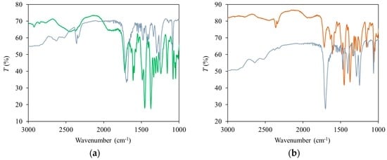 (a) IR spectra for 1-Cl (green line) and H2Cl2TPA (gray line); (b) IR spectra for 1-Br (brown line) and H2Br2TPA (gray line).