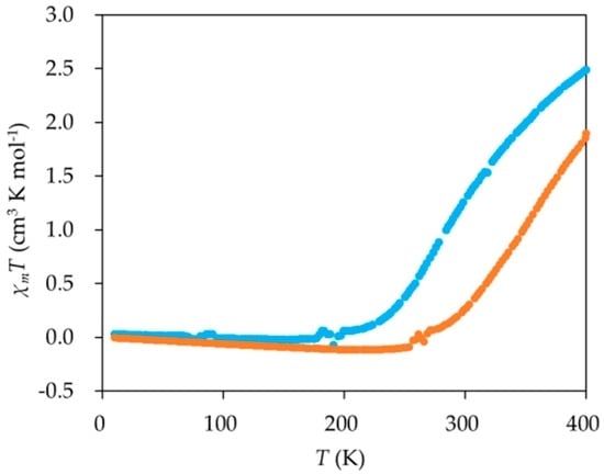 Magnetic susceptibility measurements for 1-Cl and 1-Br were performed over the temperature range of 10–400 K at a sweep rate of 1 K·min−1 with a magnetic field of 5 kOe. The χmT-T plots of 1-Cl and 1-Br in Figure 4 show that both compounds exhibited gradual spin crossover. In the low-spin state, the χmT values in 1-Cl and 1-Br were nearly zero, which was in good agreement with the expected value for low-spin Fe(II) (S = 0). Upon warming, the χmT value of 1-Cl gradually increased above 210 K and reached 2.49 cm3·K·mol−1 at 400 K, whereas the χmT value of 1-Br gradually increased above 250 K and reached 1.90 cm3·K·mol−1 at 400 K. These values were less than the expected value for high-spin Fe(II) (S = 2) because the spin crossover was not complete even at 400 K. The χmT values in 1-Cl and 1-Br at 320 K are 1.60 cm3 K·mol−1 and 0.53 cm3 K·mol−1, respectively. This indicates that 53% and 18% of low-spin Fe(II) changed to high-spin Fe(II), respectively, in 1-Cl and 1-Br at 320 K. The difference of the fraction of high-spin Fe(II) between 1-Cl and 1-Br at 320 K could also be followed from the result in the single-crystal X-ray measurement that showed the Fe(II)–N and Fe(II)–O coordination distances for 1-Cl are larger than those for 1-Br at 320 K. The difference in T1/2 between 1-Cl (314 K) and 1-Br (376 K) indicates that changing the halogen substituent on the dicarboxylic acids can influence the hydrogen bond distance and the SCO behavior without changing the molecular arrangement; however, these compounds do not exhibit abrupt SCO despite the presence of short hydrogen bonds, caused by the low dimensionality of the hydrogen bonding network.