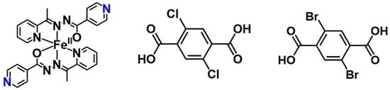 Hydrogen bonding plays an important role in various biological [], catalytic [] and crystal engineering systems []. Proton transfer or proton migration between the two components that make up a hydrogen bonding system is an important mechanism of ferroelectricity [,,]. Furthermore, switching of the conduction and magnetic properties of organic conductor crystals via deuterium transfer in a short hydrogen bond was recently reported []; however, although several interesting short hydrogen bonding systems have been reported in pure organic systems, it is still a challenge to construct short hydrogen bonding in functional coordination compounds such as in spin crossover (SCO) and valence tautomeric complexes. There are numerous reports on SCO compounds forming hydrogen bonding networks between anions or solvent molecules and SCO complexes, and these investigations demonstrated that the strength and dimensionality of the hydrogen bonding network contribute to SCO behavior, including the sharpness and hysteresis of the crossover; however, the hydrogen bonding distances in these compounds tend to be long because the pKa values of anions or solvent molecules tend to be much higher or lower than the pKa value at a proton acceptor site. Therefore, for the construction of short hydrogen bonds, it is important to introduce proton donor or acceptor molecules that have pKa values near that of the SCO complex. In this study, we have investigated a new SCO compound comprising an Fe(II) complex and a polyprotic organic acid, wherein a short hydrogen bond is formed between the Fe(II) complex and the polyprotic organic acid. There are few studies that report the crystal structure of SCO compounds with the polyprotic organic acids []. Here, 2-Acetylpyridine isonicotinoylhydrazone (HL) was used as a ligand for the Fe(II) complex. The neutral Fe(II) complex bearing this ligand has a proton acceptor site at the terminal Py ring (Scheme 1). Neutral complexes with similar ligands have been reported to exhibit SCO behavior [,]. Thus, it was expected that co-crystals comprising the neutral Fe(II) complex and a polyprotic organic acid would also exhibit SCO behavior. We focus on a group of polyprotic organic dicarboxylic acids, particularly those with halogen substituents. In the SCO compounds introducing halogen-substituted dicarboxylic acids, the hydrogen bond distance is expected to be controlled by changing the halogen substituent without changing the crystal structure. Therefore, T1/2 is also expected to be controlled by changing the halogen substituent in dicarboxylic acid. Notably, it has been reported that the T1/2 value can be controlled by modifying ligands and exchanging counter-ions in SCO compounds [,]. To confirm this hypothesis, 2,5-dichroloterephthalic acid (H2Cl2TPA) and 2,5-dibromoterephthalic acid (H2Br2TPA) were chosen as a counterpart of the hydrogen bond, where the carboxyl group in H2Cl2TPA and H2Br2TPA would act as the proton donor.