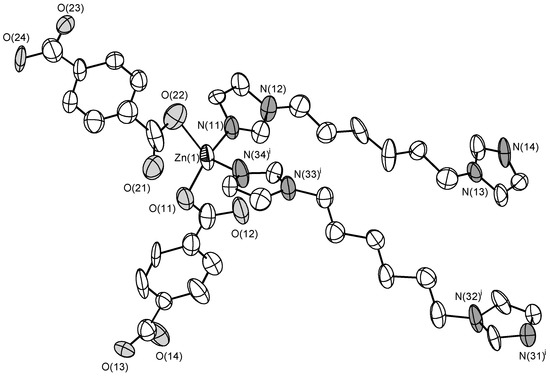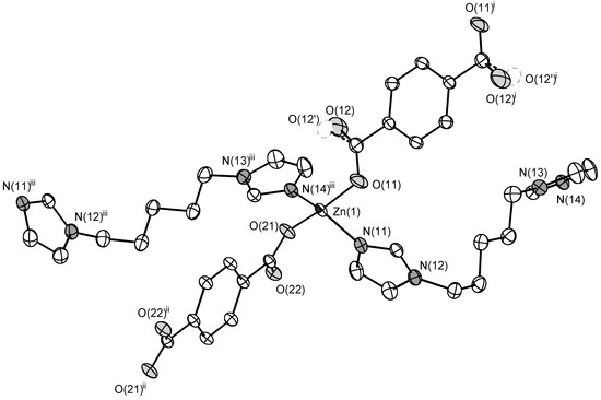 Coordination environment of Zn(II) cation in 1 (ellipsoids of 50% probability). Hydrogen atoms are omitted. Symmetry transformations used to generate equivalent atoms: (i) 1 − x, −y, 1 − z; (ii) −x, −y, −1 − z; (iii) −1 + x, ½ − y, −½ + z.