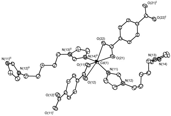 Coordination environment of Cd(II) cation in 2 (ellipsoids of 50% probability). Hydrogen atoms are omitted. Symmetry transformations used to generate equivalent atoms: (i) −x, −y, −z; (ii) 1 − x, −y, 2 − z; (iii) −1 + x, ½ − y, −½ + z.
