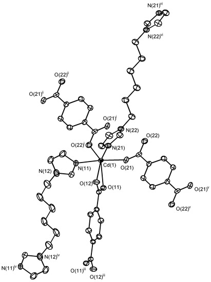 Coordination environment of Cd(II) cation in 4 (ellipsoids of 50% probability). Hydrogen atoms are omitted. Symmetry transformations used to generate equivalent atoms: (i) 2 − x, 1 − y, −z; (ii) x, 1 + y, z; (iii) 2 − x, 1 − y, 1 − z; (iv) 1 − x, 1 − y, 1 − z; (v) 2 − x, −y, −z; (vi) 1 − x, −y, −1 − z.