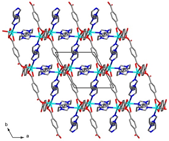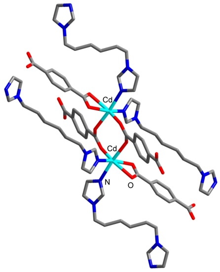 The asymmetric unit of the structure 4 consists of a Cd(II) cation, a bdc2− anion, a C6 ligand and a methanol molecule. The Cd(II) cation coordinates four carboxylate O atoms of three bdc2− anions and two N atoms of two C6 ligands (Figure 7). The coordination environment of a Cd(II) cation can be described as distorted trigonal bipyramid where one of equatorial positions is occupied by bidentate carboxylate group of bdc2− anion. Cd–N bond lengths are 2.259(3) and 2.324(4) Å. Cd–O bond lengths lie in range 2.216(3)–2.446(3) Å (average 2.34(10) Å). Two Cd(II) cations are interconnected via two bridging carboxylate groups to form binuclear {Cd2(μ2-OOCR)2(OOCR)2(C6)4} secondary building unit (SBU, Figure 8). Each SBU is joined with eight other SBUs via four bridging bdc2− anions and four bridging C6 ligands to form 8-c uninodal net with a very rare self-penetrated topological type ilc and a point symbol 424.5.63 [42,43]. The crystal packing in 4 is shown on Figure 9. The void volume occupied by guest methanol molecules was calculated to be 14.8% according to PLATON routine.