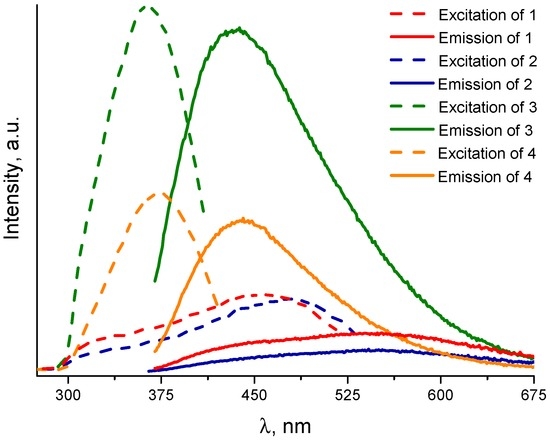Excitation and emission luminescence spectra of the compounds 1–4.