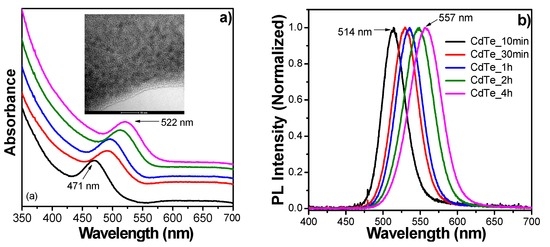 In both experimental methods investigated here, we obtained the CdTe core by adding the precursor NaHTe to the solution containing the surface ligand 3-mercaptopropionic acid (MPA) and Cd2+ ions [28]. Figure 1 displays the UV–vis absorption and photoluminescence (PL) spectra relative to the time evolution of the CdTe core during the synthesis. The absorption and emission bands shifted to longer wavelength—from 471 to 522 nm (Figure 1a) and from 514 to 557 nm (Figure 1b), respectively—demonstrating that nanoparticle size increased as the procedure progressed. The absorption spectra are assigned to the well-defined first excitonic 1S3/2(h) → 1S(e) transition. The inset in Figure 1a shows a typical image of the CdTe core obtained with 4 h of synthesis, and reveals virtually spherical and well-dispersed nanocrystals; no aggregation occurred after the surface ligand MPA was replaced by 1-dodecanethiol (DDT). The procedure for ligand exchange and the histogram of the particle size distribution is in the Supplementary Material. The calculated size from the empirical equation proposed by Peng et al. [29] gave a size of 2.8 nm, which is in agreement with the histogram obtained from TEM analysis (Figure S1).