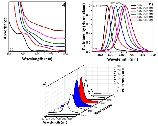UV–vis absorption (a) and PL spectra (b) and (c) of CdTe/CdS QDs with one to five layers of CdS synthesized with CdTe core of 2.17 nm diameter.
