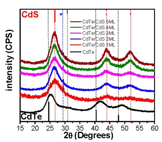 X-ray diffraction patterns of CdTe core and CdTe/CdS core/shell quantum dots (QDs) with different numbers of layers (one to five) of CdS. * Impurities or byproducts not identified in the JCPDS data base.