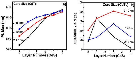 Figure 4a revealed that the emission bands’ position varied as a function of the number of CdS layers deposited on the CdTe/CdS QDs synthesized with CdTe nanocrystals of 2.17 nm, 3.10 nm, and 3.45 nm as follows: ~134, ~91, and ~70 nm, respectively. Three explanations exist for this trend: (1) Smaller nanocrystals afforded larger displacement because they were more susceptible to the strain effects that the CdS layers exerted over the core surface. These effects may have extended the luminescence spectra of these materials from the green to the near infrared regions [18]; (2) Thicker layers did not effectively compress the cores consisting of slightly larger nanocrystals (CdTe nanocrystals of 3.10 nm and CdTe of 3.45 nm), so their emission bands shifted significantly less; (3) Thicker CdS layers may have grown on smaller nanocrystals (CdTe nanocrystals of 2.17 nm, Table S2), which may have favored strain effects as compared with the CdS layers grown on larger nanocrystals.