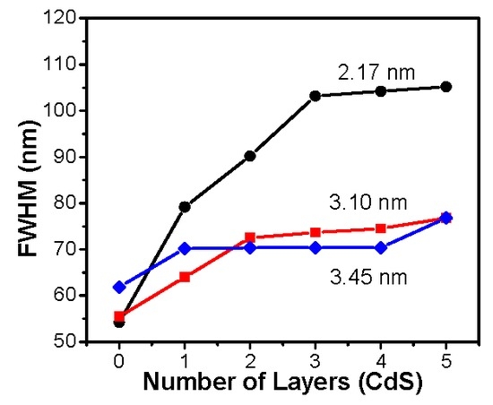 Figure 5 corresponds to the plots of the full width at half maximum (FWHM) as a function of the number of CdS layers for the CdTe/CdS QDs prepared with CdTe nanocrystals of different sizes. All of the plots revealed that the FWHM values increased as more CdS layers grew on the nanocrystals’ surface. In other words, CdS deposition elicited a larger size distribution of QDs [17], probably because CdS did not homogeneously coat the CdTe core. Figure 5 demonstrates that the CdTe nanocrystals of 2.17 nm exhibited a wider size distribution for a larger number of deposited CdS layers. This happened because smaller nanocrystals were more susceptible to strain effects, which may have prompted size polydispersion. It is important to emphasize that some core/shell systems like CdSe/CdS present FWHM values that do not depend on the shell’s constituent thickness. This suggests good control of nanocrystals’ size distribution as larger amounts of the shell constituent grow on the shell [25].