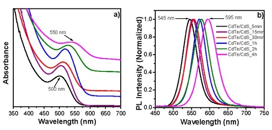 For the one-pot approach, we used thiourea as the sulfur ions precursor. The excess Cd2+ ions from the synthesis of the CdTe core reacted with the S2– ions released from thiourea to form CdS; the latter was arranged around CdTe to furnish the CdTe/CdS structure [32,36]. The deposition of a thin CdS monolayer over these CdTe nanocrystals can generate CdTe/CdS core/shell with a 1:1 Cd:S ratio. Figure 6 presents the UV–vis and PL spectra obtained as the synthesis of these systems evolved.