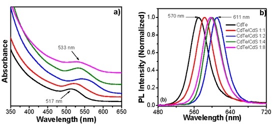 Figure 7 illustrates the UV–vis absorption and PL spectra of the CdTe/MPA nanocrystals and the CdTe/CdS 1:1, 1:2, 1:4, and 1:8 core/shell systems recorded at 3 h of synthesis.