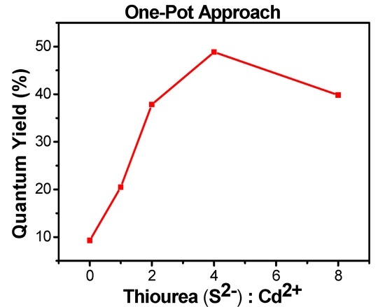 Fluorescence quantum yield (QY) versus ratio thiourea/Cd2+ via the one-pot approach.