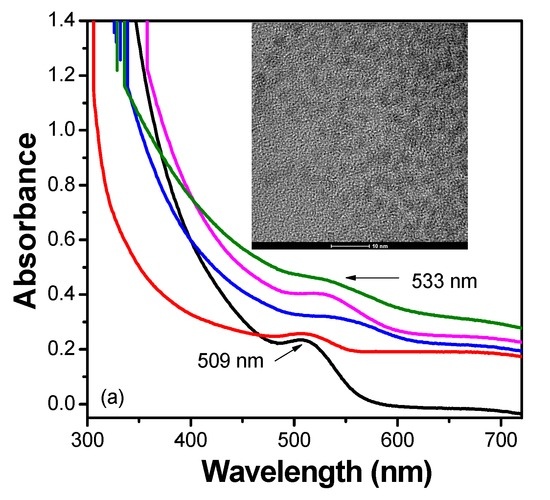 Figure 9 shows the UV–vis absorption spectra of the CdTe/CdS QDs solubilized in toluene, after ligand exchange (information on the procedure can be found in the Supplementary Materials). The spectra revealed shifts similar to those observed for water-soluble CdTe/CdS QDs (Figure 7); that is, shifts toward longer wavelengths occurred in the spectra of the 1:1 and 1:2 systems, whereas the 1:4 and 1:8 presented shifts toward shorter wavelengths. The TEM micrograph (inset of Figure 9) shows that the nanocrystals’ morphology did not change after growth of the CdS shell—the particles remained approximately spherical and well dispersed in organic solvent, with no aggregation on the carbon grid. The histogram of size distribution is showed in Figure S6. We achieved similar results for the other compositions.