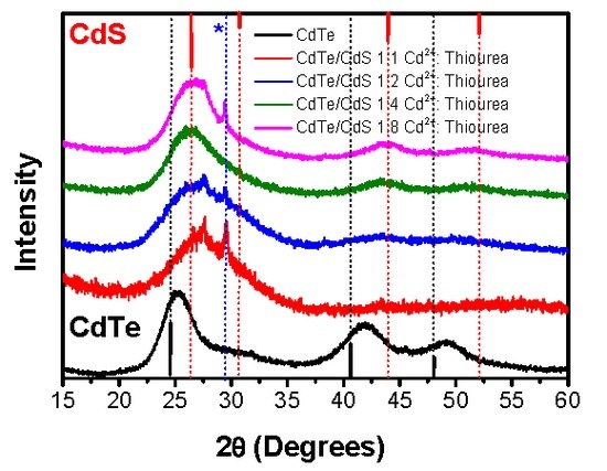 X-ray diffraction patterns of the CdTe and CdTe/CdS core/shell growth with Cd2+:thiourea (S2–) molar ratios of 1:1, 1:2, 1:4, and 1:8. * Impurities or byproducts not identified in the JCPDS database.