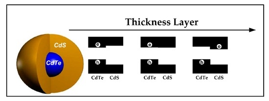 To grow an external layer efficiently over the core region, it is important to take the lattice mismatch of the core and shell materials into account. The larger the mismatch in the lattice parameter between the core and the shell, the greater the effect of stress on the core. Moreover, this parameter must be small, to facilitate crystallization and growth of both constituents in the same structure. In addition, to prevent defects from appearing on the surface of the core/shell interface, it is necessary that the shell material display high reactivity and selectivity toward the core material. It is also crucial to control shell thickness efficiently; a thin shell is not sufficient to correct surface defects, while a thick shell may cause the transformation of core/shell type I to type II or vice versa, due to the compression effect on the core [26,27]. Smith et al. [18] reported that a thicker shell elicited CdTe/ZnSe conversion from a type I to a type II system because the strain over the core constituent increased.