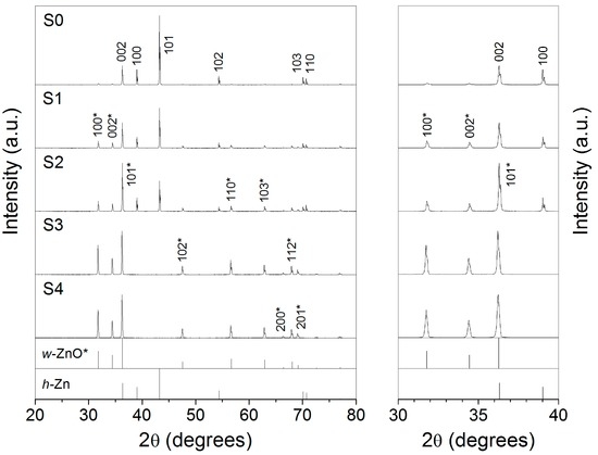 Figure 1 shows the X-ray patterns of the different samples. The set of X-ray reflections observed in the diffractogram of the precursor (S0) confirms that it is hexagonal metallic zinc (h-Zn; JCPDS #004–0831). However, an inspection in the range of low-diffraction angles reveals two tiny peaks at 31.85° and 34.46°, which match with the diffraction angles of 100 and 002 reflections of wurtzite ZnO phase (w-ZnO; JCPDS #036–1451). The latter indicates formation of native oxide; most likely on the surface of Zn grains. This is attributed to exposition of the metallic precursor to air atmosphere.