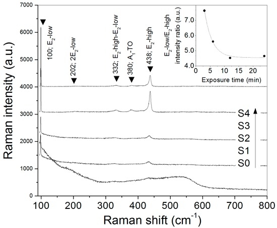 Raman spectra of the precursor powder (S0) and the products obtained after its thermal oxidation (900 °C; air atmosphere) during different times: 3 (S1), 6 (S2), 12 (S3), and 24 min (S4). Inset: Dependence of E2–low/E2–high intensity ratio with the exposure time.
