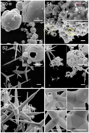 Figure 3 shows SEM micrographs of the precursor powder and the products obtained after its thermal oxidation during different times. As can be seen, the Zn powder precursor (S0) is constituted by micrometric rounded particles of different size. A detailed inspection reveals they are aggregates of sub-micrometric grains, generating particles with rough surface. After 3 min upon thermal oxidation (S1), the rounded particles are still observed, nevertheless, elongated micro- and nanostructures have grown on their surface (see solid circle in Figure 3-S1). Besides these two morphologies, a few tetrapods are also observed (see dashed circle in Figure 3-S1). In order to elucidate the formation mechanism of the elongated structures, an elemental analysis was performed (see inset of Figure 3-S1). It was found that the elongated structures have higher oxygen content than grains located at their base, indicative of a chemical composition gradient.