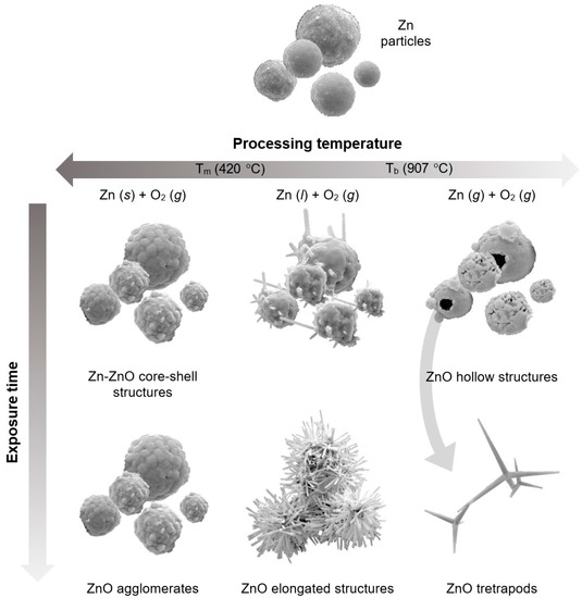 On the basis of the growth mechanism discussed above, a scheme of possible ZnO structures that can be obtained by thermal oxidation of zinc powders is presented in Figure 4.